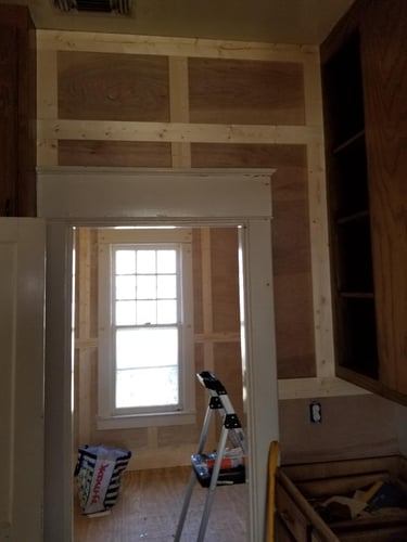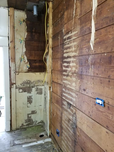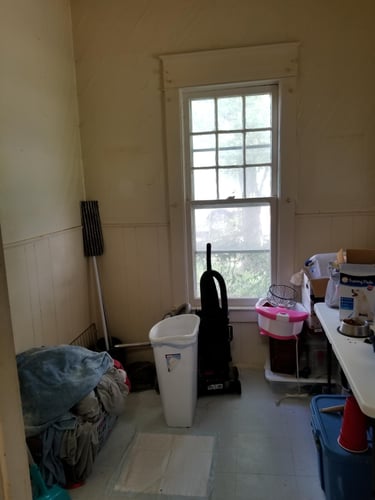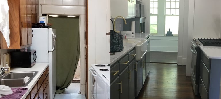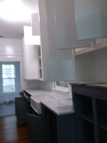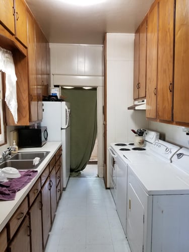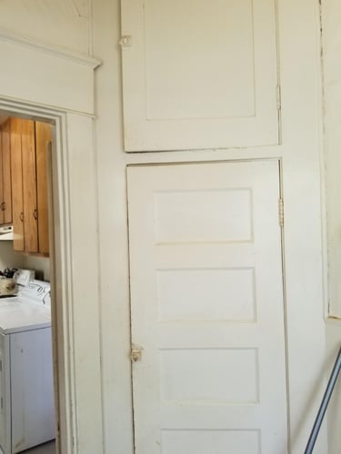 My husband tore out the water heater closet at the other side of the stove in the first picture. Nasty is an understatement-rodent and roach infested kind of nasty. We used all of the cabinets that appeared to be from the 1950's-1960's they where solid wood and the uppers where 5 feet tall. The uppers on the stove side where used in the new laundry room. One set we used at the end of the sink cabinet without the doors for a spot for the microwave and open shelving for storage.