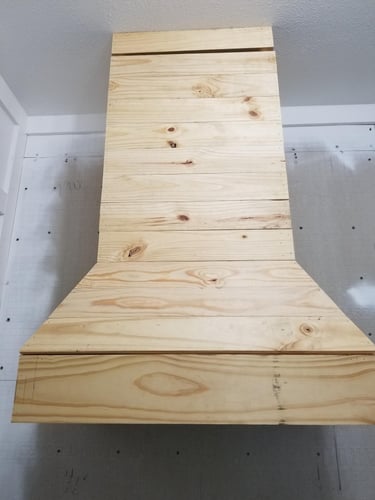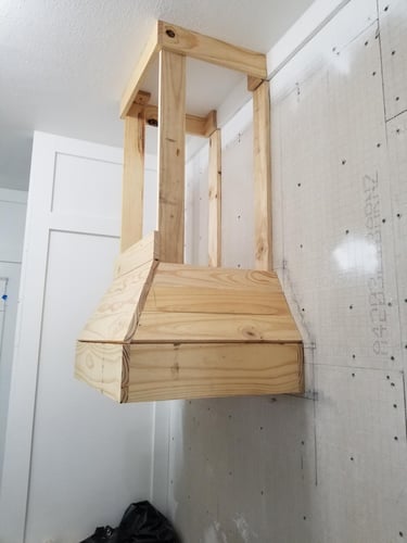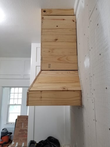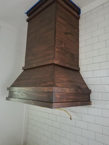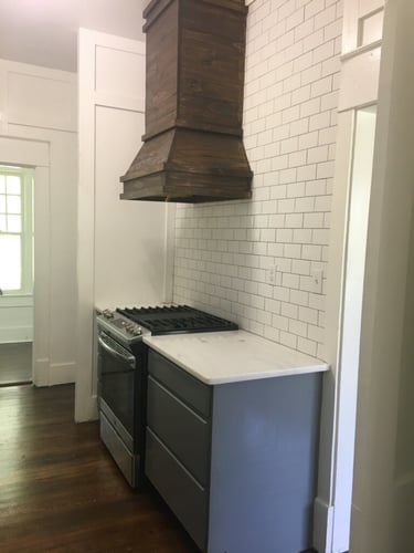 Our carpenter custom built the vent hood from a rough, and I mean rough, drawing I did. He also installed all the tile throughout the house including the vent hood wall from counter to ceiling.