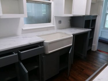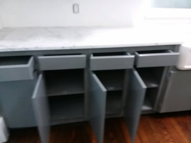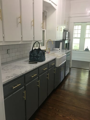 We did have a professional painter paint the interior of the house including the kitchen and the cabinets. I went with a gray on the bottom and white on the top with 3.5" brass T-bar hardware.