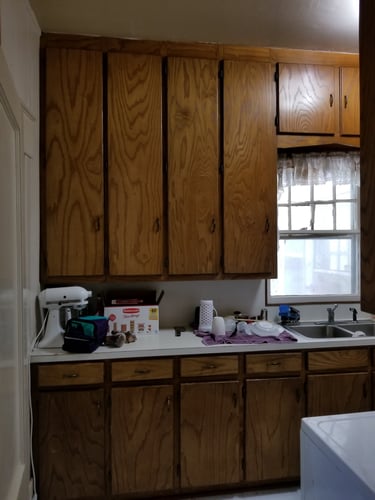 My husband tore out the water heater closet at the other side of the stove in the first picture. Nasty is an understatement-rodent and roach infested kind of nasty. We used all of the cabinets that appeared to be from the 1950's-1960's they where solid wood and the uppers where 5 feet tall. The uppers on the stove side where used in the new laundry room. One set we used at the end of the sink cabinet without the doors for a spot for the microwave and open shelving for storage.